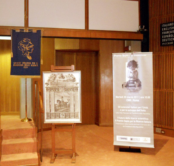 foto che raffigura il primo manifesto dell'adunanza degli scienziati italiani del 1839 "Società Italiana per il Progresso delle Scienze" ed accanto il manifesto del premio Sapio 2011